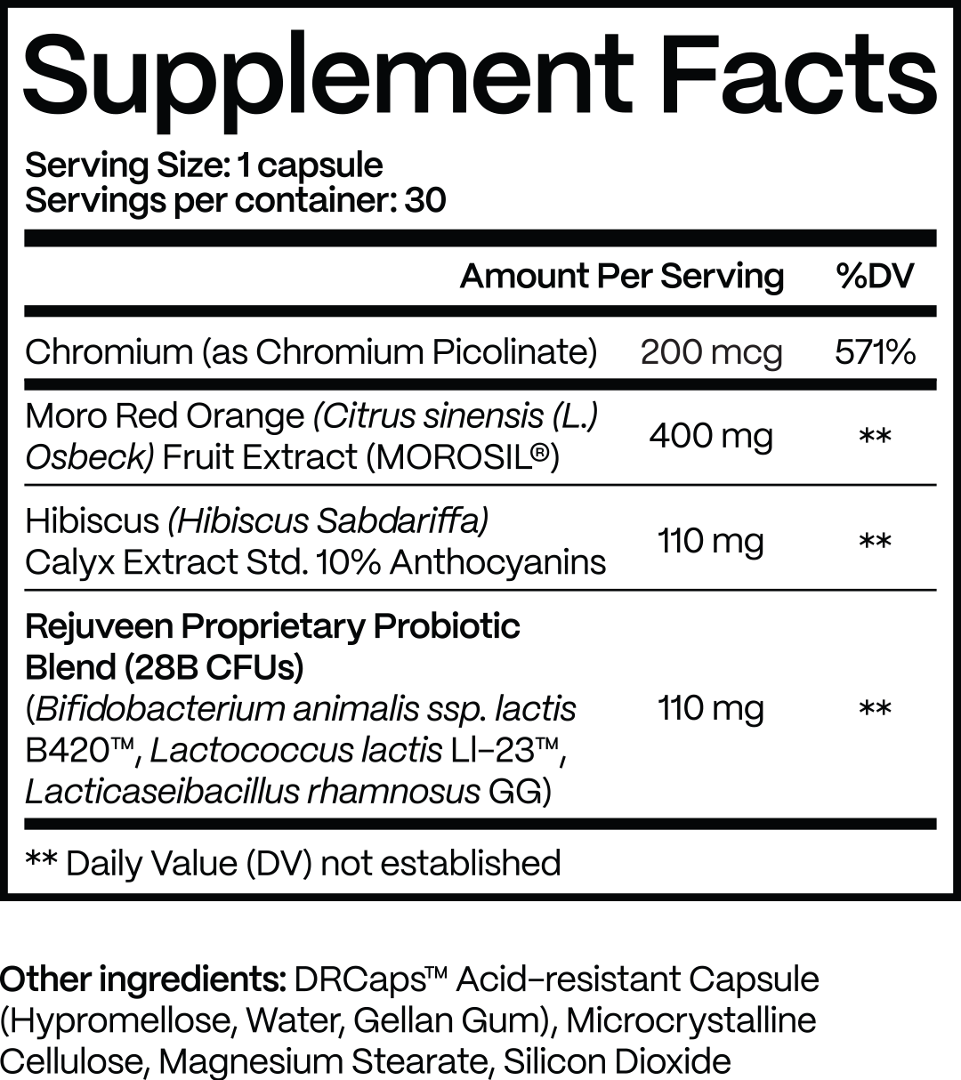 We've carefully selected each ingredient based on clinical research: probiotics known to support healthy weight management and digestion, plus powerful botanical extracts including Morosil (Moro Blood Orange), Hibiscus, and Chromium Picolinate.