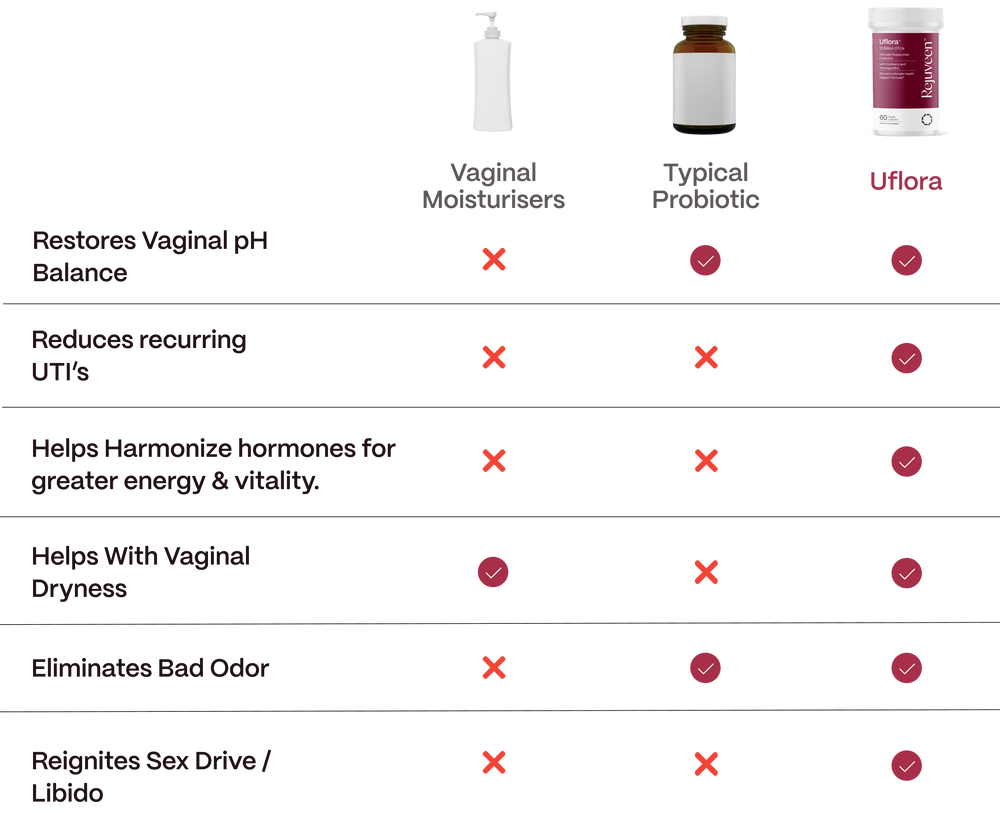 Uflora can help you enjoy a continuous improvement in vaginal comfort, natural lubrication, and restored libido in the next 12 weeks.
